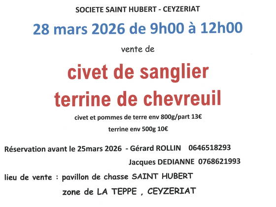 VENTE DE CIVET ET TERRINE SOCIETE DE CHASSE SAINT HUBERT