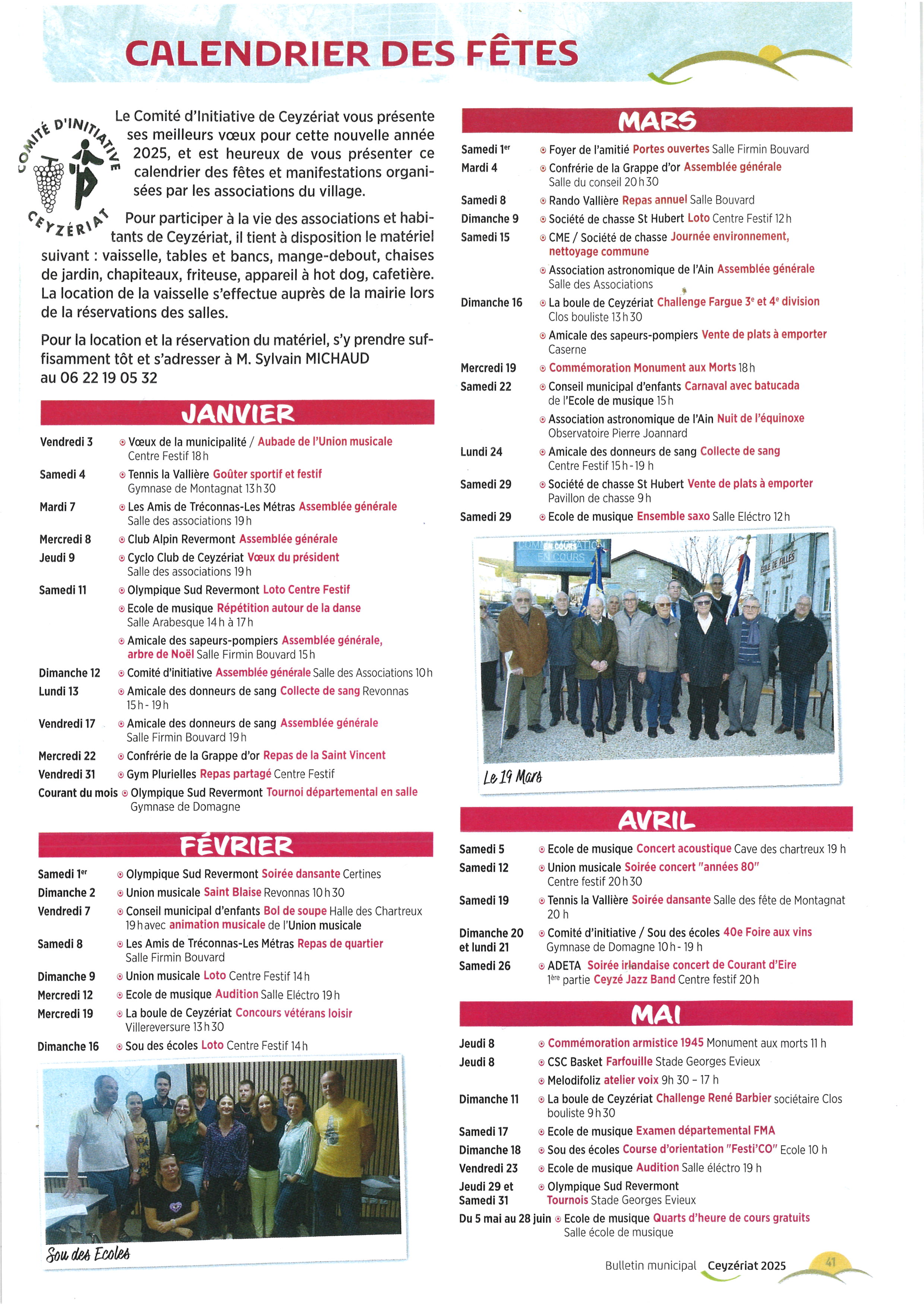 Pour la réservation et location de matériel, il suffit de s'y prendre suffisamment tôt et s'adresser à M. Sylvain MICHAUD au 06 22 19 05 32