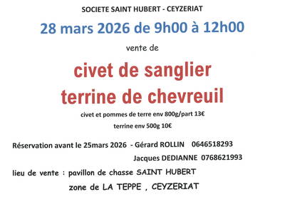 Vente de civet de sanglier et de terrine de chevreuil par la Société de Chasse Saint Hubert le 28 mars 2026 de 9h à 12h au Pavillon de Chasse Zone de La Teppe