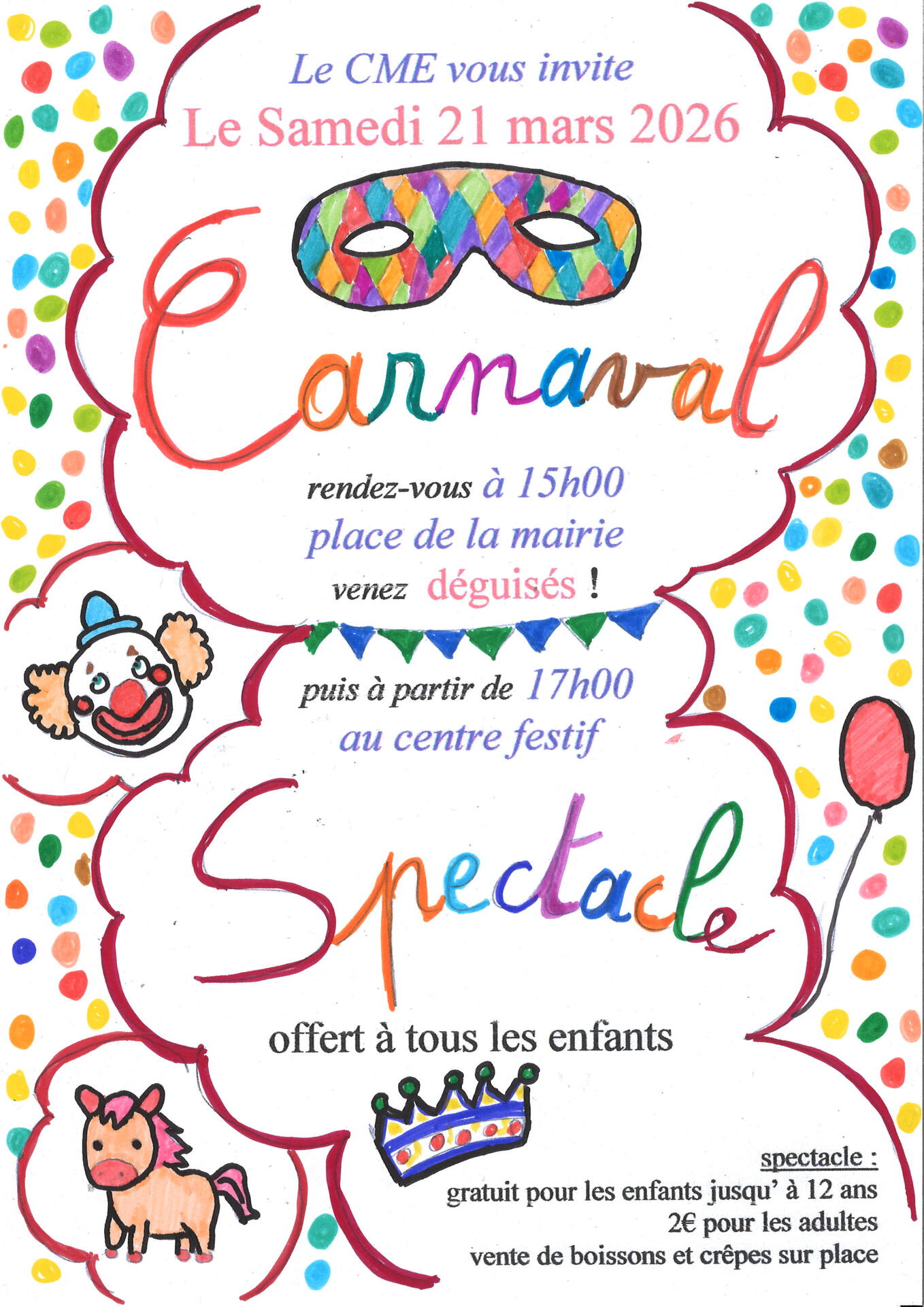 RENDEZ VOUS LE 15 MARS 2026 PLACE DE LA MAIRIE CARNAVAL PAR CME